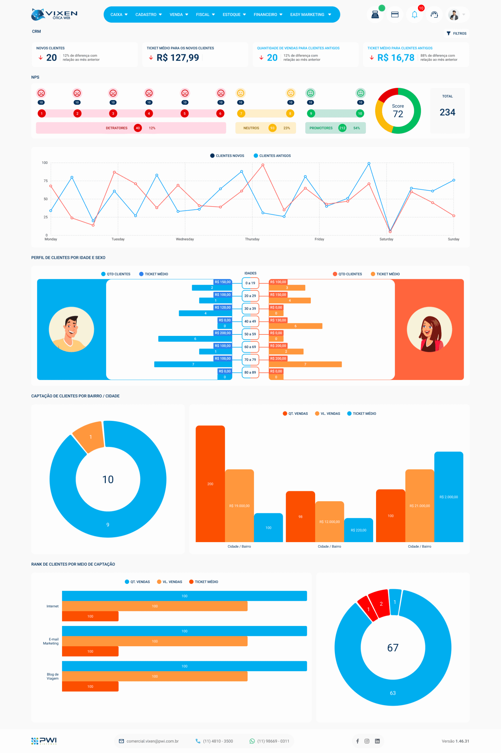 Painel mostra o perfil do cliente por idade e sexo, além do ticket médio de suas compras. Possibilita que você faça ações de marketing personalizadas que agradem a sua clientela.